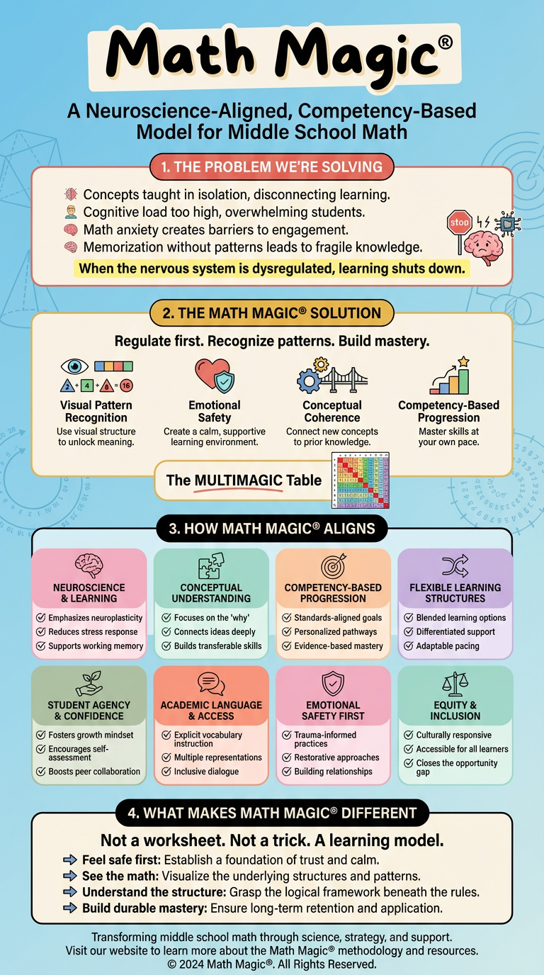 Math Magic integrates neuroscience, pattern recognition, emotional regulation, and competency-based progression to support deep, durable learning for middle school students.